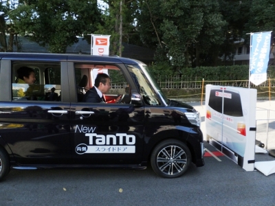 午前中会派会議をしていたところ、県内の自動車メーカーで一番雇用の多いダイハツ工業さんが県庁で行われた試乗会で、ダイハツ タントのスマートアシストの体験をさせていただきました。