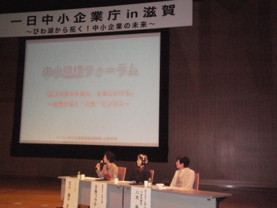 そこで、今日はピアザ淡海で中小企業庁、滋賀県、近畿経済産業局主催の一日中小企業庁in滋賀が開催され、午前中のフォーラムとブースを見に行きました。フォーラムでは、滋賀県の地域資源・自然・文化・歴史や特産を活かした3人の女性経営者のお話を聞かせていただきました。