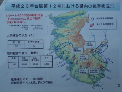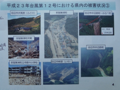 そこで今回、平成23年9月4日深夜に発生しました台風12号における和歌山県と和歌山県田辺市の被害状況、それ以後の和歌山県と和歌山県田辺市の防災対策について政務調査してまいりました。